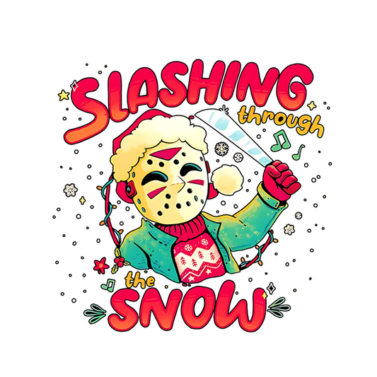 A playful and colorful illustration featuring a festive character in a mask, holding a knife, with the text "Slashing through the Snow." heat press transfers
