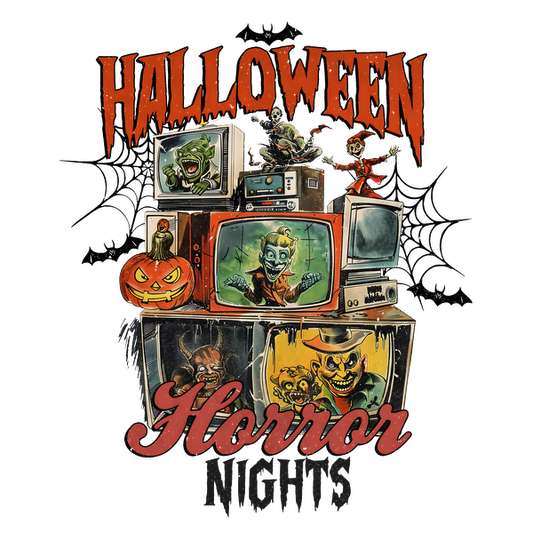 Celebrate Halloween with this spooky design featuring vintage televisions displaying eerie characters and a vibrant pumpkin centerpiece! dtf prints