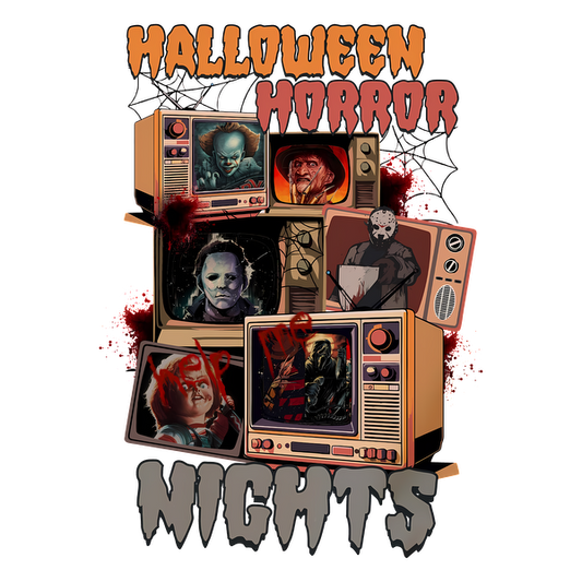 A spooky design featuring iconic horror characters displayed on vintage televisions, perfect for Halloween Horror Nights enthusiasts.dtf regular iron