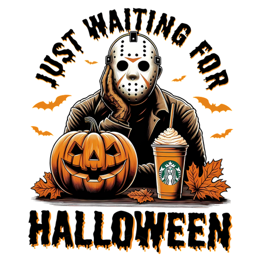 A spooky graphic featuring a masked figure with a pumpkin and a coffee, captioned "Just Waiting for Halloween."dtf regular iron