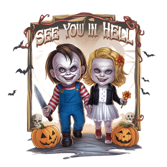Prix habituel À partir de £0.75 GBPPrix habituelPrix unitaire / par£2.40 GBPPrix promotionnel À partir de £0.75 GBPA spooky illustration of two eerie, cartoonish children, holding a knife and a flower, framed by Halloween elements. dtf prints
