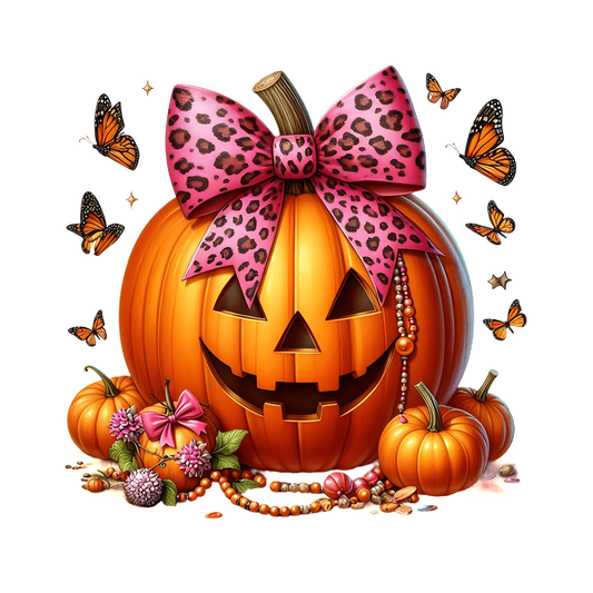 A cute pink jack-o'-lantern adorned with a leopard print bow, surrounded by colorful flowers, pumpkins, and butterflies. dtf prints
