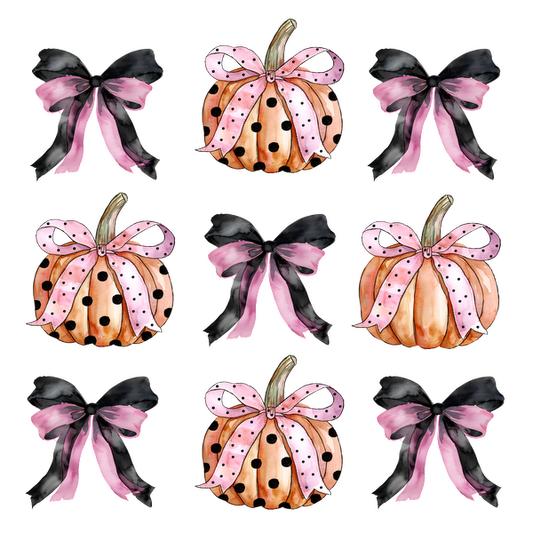 This whimsical pattern features charming pumpkins adorned with pink and black polka dot ribbons, perfect for autumn decor.