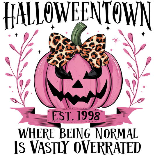 A playful design featuring a pink pumpkin with a leopard print bow, celebrating Halloween and nonconformity since 1998. dtf prints