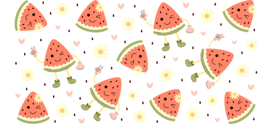 A cheerful pattern featuring cute, smiling watermelon slices with playful arms and flowers.UV Transfers