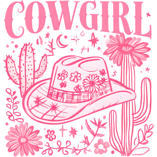 A vibrant collection of Western-style items featuring pink cowboy boots and apparel.DTF Transfers