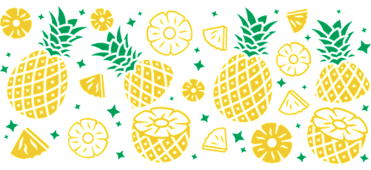 A vibrant pattern featuring pineapples, lemon slices, and various tropical fruits.UV Transfers