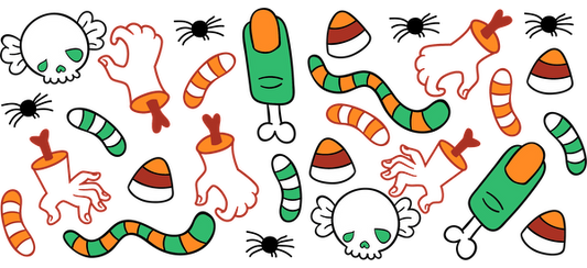 Colorful Halloween-themed illustration featuring spooky skulls, worms, and candy.UV Transfers