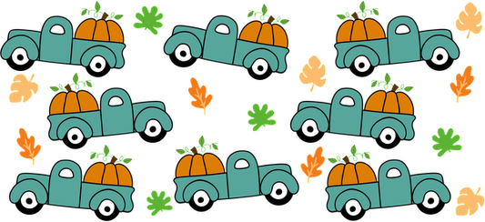 A whimsical pattern featuring teal trucks loaded with pumpkins and autumn leaves.UV Transfers