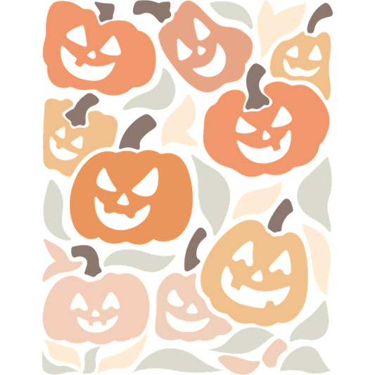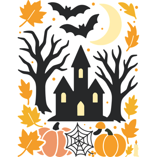 A whimsical collection of Halloween-themed illustrations featuring pumpkins, cats, and haunted houses.DTF Transfers
