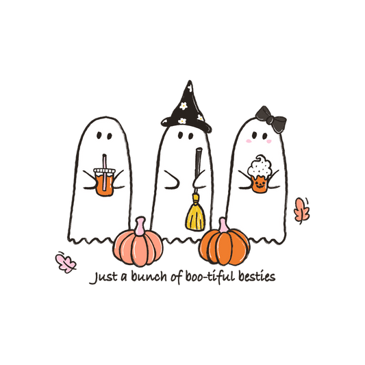 Three cute, colorful ghost characters with bows and cheerful expressions surrounded by flowers.DTF Transfers