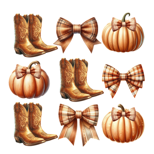 A charming collection of cowboy boots, plaid bows, and pumpkins, perfect for a cozy autumn vibe! dtf transfers
