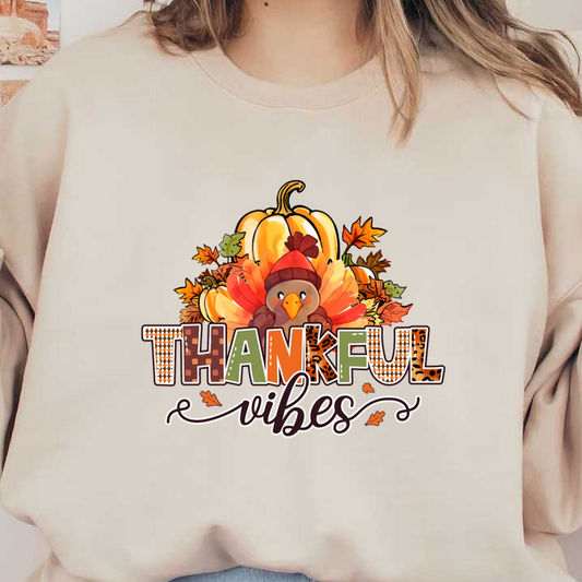 A cheerful illustration featuring a turkey surrounded by autumn leaves and a pumpkin, showcasing the text "THANKFUL VIBES." dtf transfers