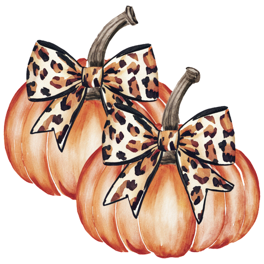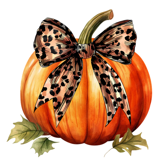 A charming orange pumpkin adorned with a stylish leopard print bow, surrounded by vibrant green leaves. heat press transfers