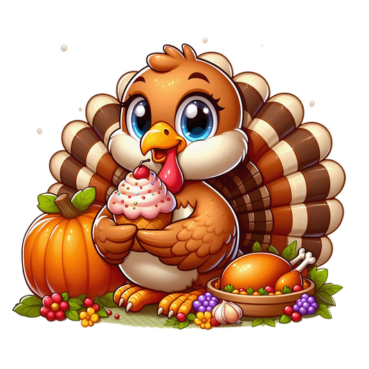 A cheerful cartoon turkey holds a cupcake, surrounded by a pumpkin, fruits, and a festive platter, celebrating Thanksgiving.dtf regular iron
