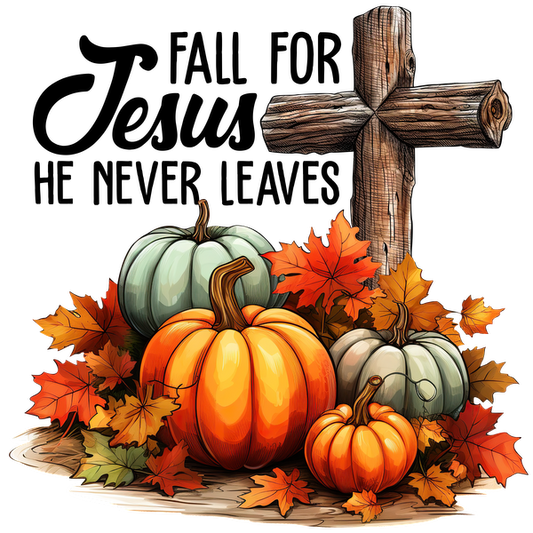 A warm autumn-themed design with the uplifting message: "Fall for Jesus, He Never Leaves."DTF Transfers