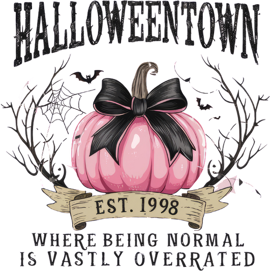 A whimsical design featuring a pink pumpkin and black bow, celebrating "Halloween Town," established in 1998, with a quirky motto. dtf transfers