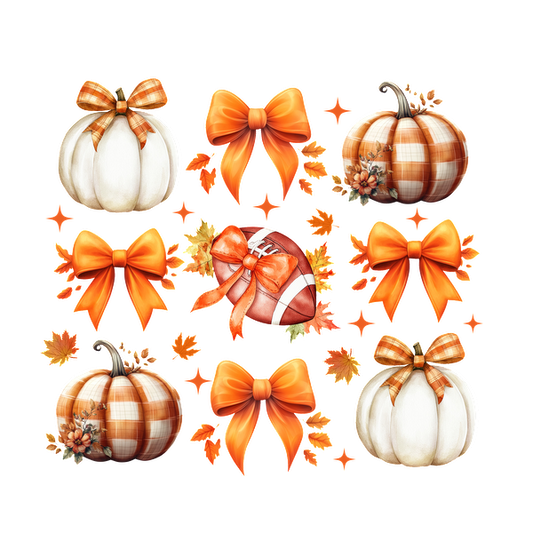 A charming collection of autumn-themed decorations featuring white and orange pumpkins, festive bows, and a football, perfect for fall celebrations. heat press transfers