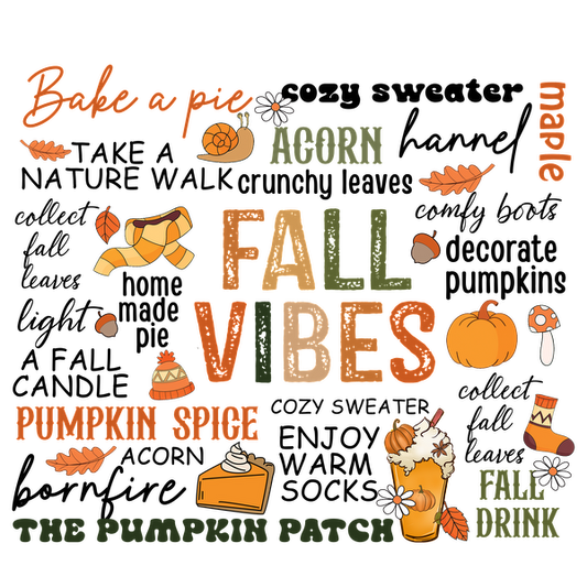 Celebrate the cozy season with whimsical fall-themed words and illustrations, featuring pumpkins, acorns, and pumpkin spice delights! heat press transfers