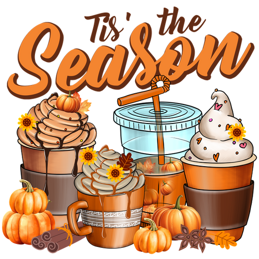 A vibrant autumn-themed illustration featuring four delightful coffee cups with seasonal toppings, surrounded by pumpkins and floral accents. dtf transfers