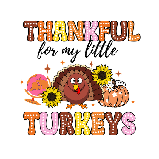 Colorful and festive illustration featuring a happy turkey surrounded by sunflowers, pumpkins, and the words "Thankful Turkeys." dtf transfers