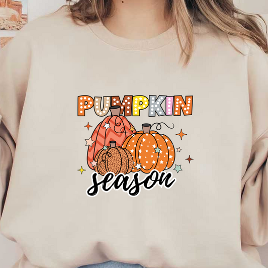 Celebrate "Pumpkin Season" with a whimsical design featuring colorful pumpkins adorned with stars and a playful typography style! heat press transfers