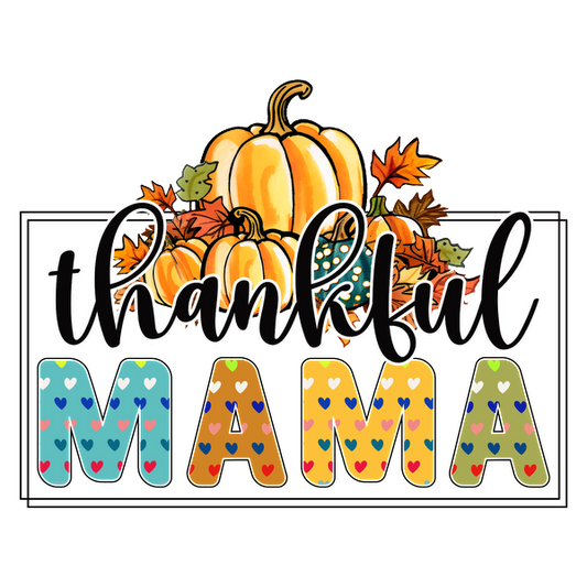 A cheerful autumn-themed design featuring pumpkins and leaves with the phrase "thankful MAMA" in colorful, playful lettering. dtf transfers