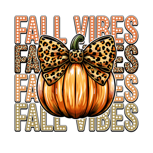 A vibrant orange pumpkin with a leopard print bow, featuring "Fall Vibes" text in the background for seasonal charm. dtf prints