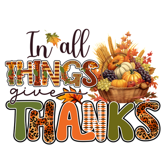 A colorful autumn-themed graphic featuring the phrase "In all things give thanks" adorned with pumpkins, grapes, and fall foliage. dtf transfers