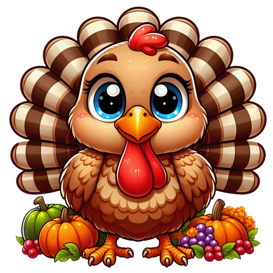 This adorable cartoon turkey, with big blue eyes and a vibrant feathered tail, is surrounded by colorful autumn harvest fruits and vegetables.