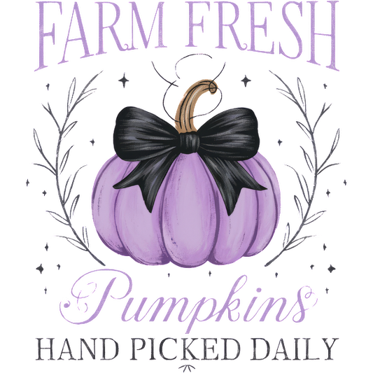 A charming illustration of a purple pumpkin with a bow, featuring the text "Farm Fresh Pumpkins - Hand Picked Daily." heat press transfers