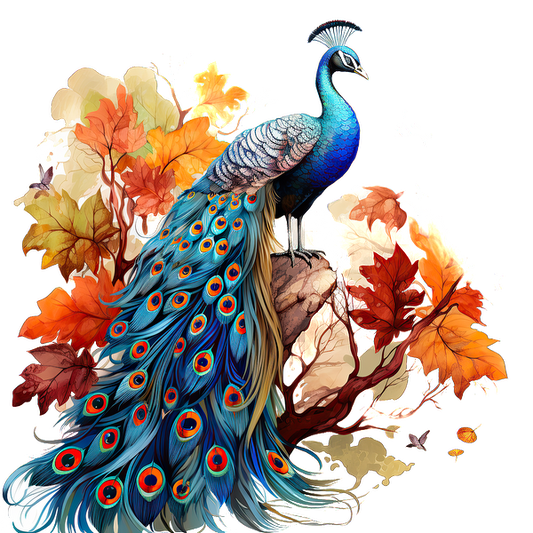 A vibrant peacock stands majestically on a rock, surrounded by colorful autumn leaves. dtf transfers