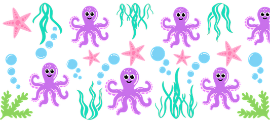 A playful underwater scene featuring cute purple octopuses, colorful starfish, and vibrant seaweed with cheerful bubbles.UV Transfers heat press transfers