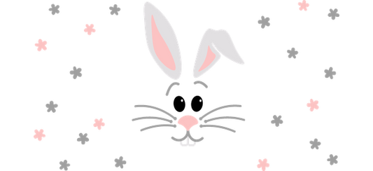 A cute illustration of a rabbit's face with big ears, a pink nose, and surrounded by colorful dots.UV Transfers dtf transfers