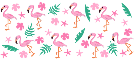 A vibrant tropical pattern featuring pink flamingos, colorful flowers, and lush green leaves, perfect for summer decor.UV Transfers dtf prints