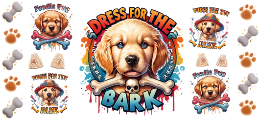 A playful graphic featuring a cute golden retriever puppy surrounded by colorful designs, bones, and the phrase "Dress for the Bark."UV Transfers dtf transfers