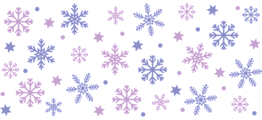 A whimsical pattern of light blue and pink snowflakes and stars scattered against a dark background, perfect for winter decor.UV Transfers dtf transfers