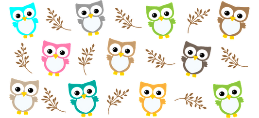 A colorful collage of adorable, cartoon-style owls in various shades, accompanied by stylized autumn leaves.UV Transfers heat press transfers