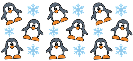A cheerful pattern featuring cute cartoon penguins and blue snowflakes, perfect for winter-themed designs and decorations.UV Transfers heat press transfers