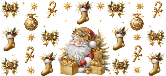 A festive illustration featuring Santa surrounded by gold-themed Christmas decorations, including gifts, stockings, ornaments, and holiday greenery.UV Transfers dtf transfers