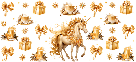 A whimsical scene featuring a golden unicorn surrounded by festive gifts, bows, and tea cups, all in warm, cheerful tones.UV Transfers heat press transfers