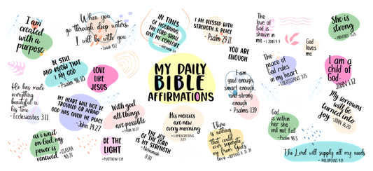 My Daily Bible Affirmations notebook with colorful illustrations.UV Transfers