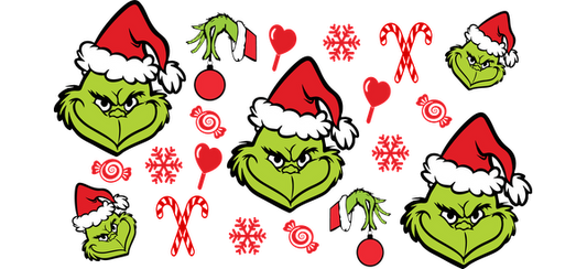 A vibrant, festive pattern featuring the Grinch in a Santa hat among Christmas ornaments, candy canes, and snowflakes.UV Transfersdtf regular iron