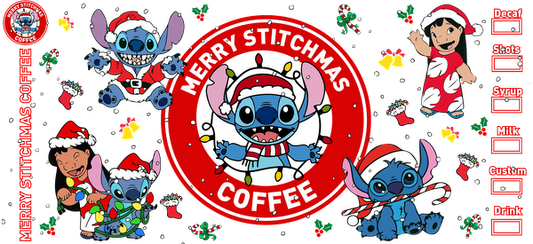 Celebrate the holidays with Merry Stitchmas Coffee, featuring adorable Stitch and friends in festive attire, perfect for seasonal cheer!UV Transfers dtf prints