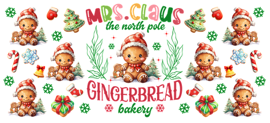 A festive design featuring adorable gingerbread characters, holiday treats, and cheerful decorations for "Mrs. Claus' Gingerbread Bakery."UV Transfersdtf regular iron