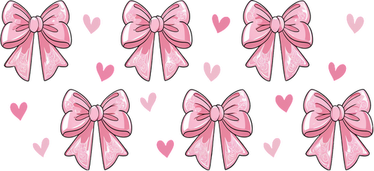A charming collection of pink bows adorned with delicate patterns, surrounded by whimsical hearts, perfect for cute decorations.UV Transfers heat press transfers