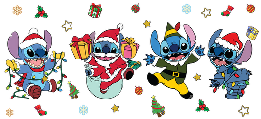 Celebrate the holidays with this festive illustration featuring Stitch in various cheerful Christmas outfits, surrounded by gifts and decorations!UV Transfers dtf prints