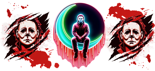 A vibrant graphic featuring the iconic horror character Michael Myers, surrounded by bold splashes of red and a neon crescent.UV Transfers dtf prints