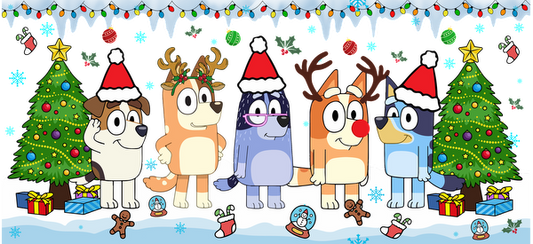 A festive gathering of cheerful cartoon dogs in Christmas hats, surrounded by trees, decorations, and gifts in a snowy setting.UV Transfers heat press transfers