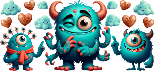 A colorful trio of cute cartoon monsters with playful expressions, surrounded by fluffy clouds and hearts, radiating joy and fun.UV Transfersdtf regular iron